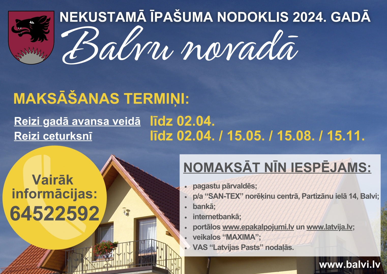 Balvu novada pašvaldība ir izsūtījusi maksāšanas paziņojumus par nekustamā īpašuma nodokļa (NĪN) kārtējo maksājumu 2024. taksācijas gadam. Ja šis paziņojums nav saņemts, lūdzam mēneša laikā par to informēt Balvu novada pašvaldības nekustamā īpašuma nodokļu administratorus.