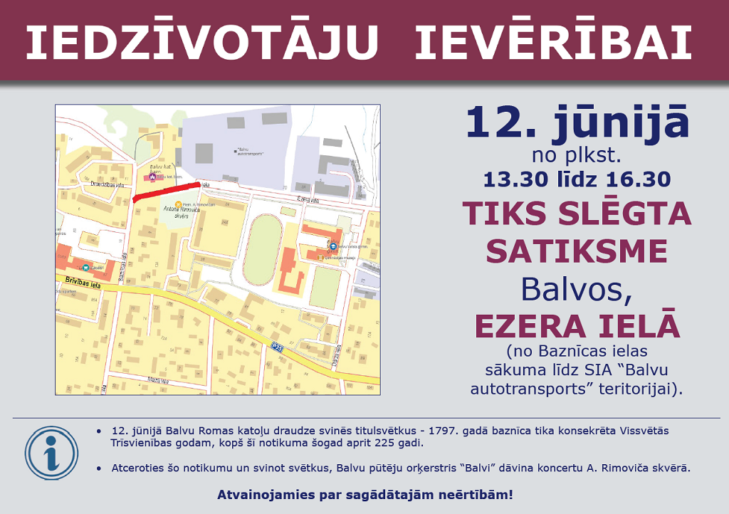 2022. gada 12. jūnijā no plkst.13.30 līdz plkst.16.30, sakarā ar pūtēju orķestra "Balvi" koncertu A. Rimoviča skvērā, tiks slēgta satiksme Ezera ielā Balvos (no Baznīcas ielas līdz SIA "Balvu autotransports" teritorijai).