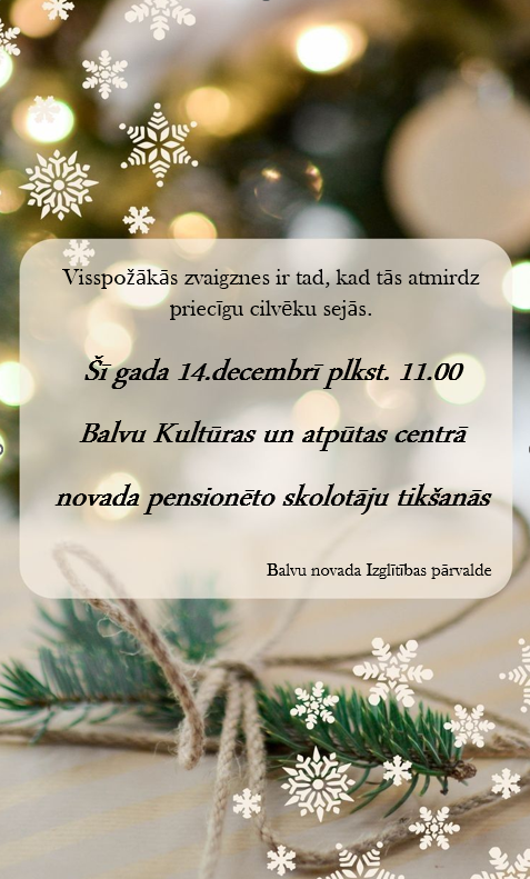 Šī gada 14.decembrī plkst. 11.00 Balvu Kultūras un atpūtas centrā novada pensionēto skolotāju tikšanās.