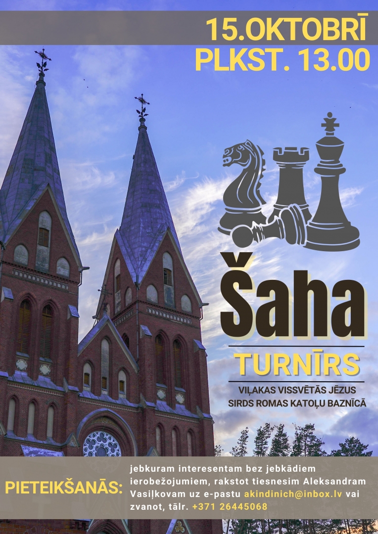 15.oktobrī plkst.13.00 Viļakas Vissvētās Jēzus Sirds Romas katoļu baznīcā notiks šaha turnīrs.