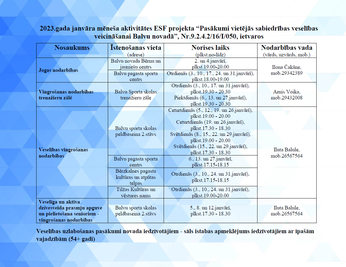 2023.gada janvāra mēneša aktivitātes ESF projekta “Pasākumi vietējās sabiedrības veselības veicināšanai Balvu novadā”, Nr.9.2.4.2/16/I/050, ietvaros.