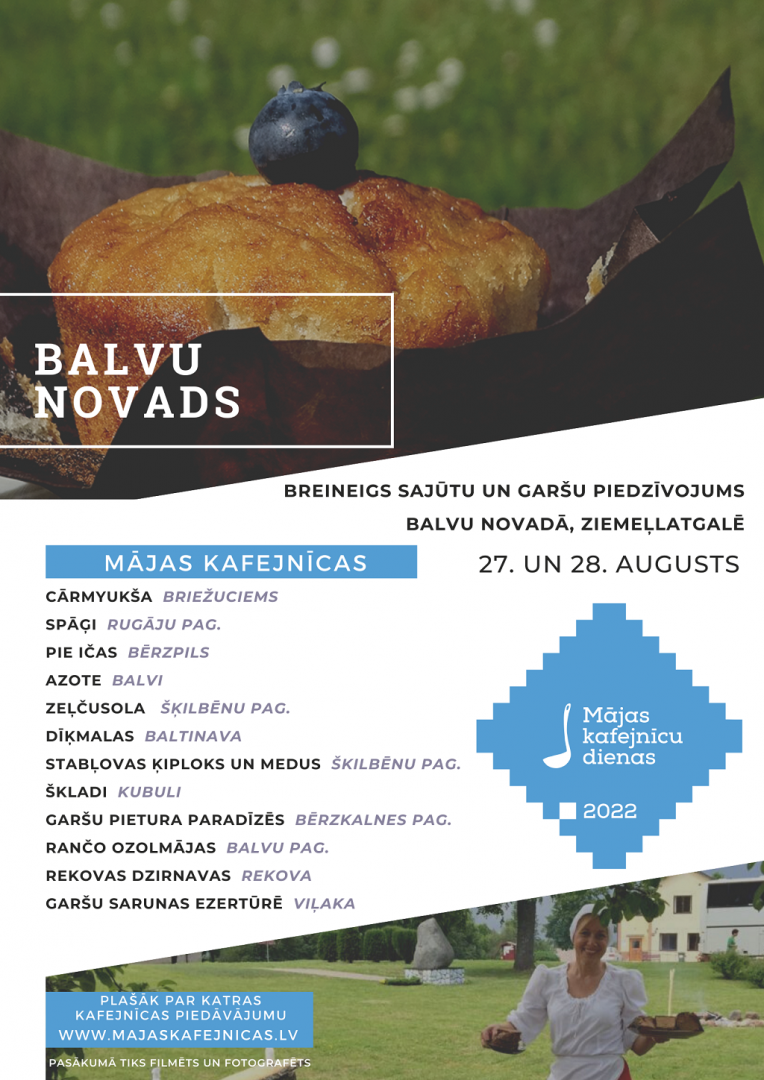 Aicinām uz breineigu garšu un sajūtu piedzīvojumu Ziemeļlatgalē - “Mājas kafejnīcu dienām 2022” Balvu novadā! 27. un 28. augustā Balvu novada saimnieces un saimnieki būs parūpējušies par īpašu vasaras svētku noskaņu un gardiem ēdieniem, atverot savu saimniecību durvis, pagalmus, terases, dārzus un ierīkojot tajos improvizētas mājas kafejnīcas ar kultūras programmām, produkcijas tirdziņiem un cita veida aktivitātēm.