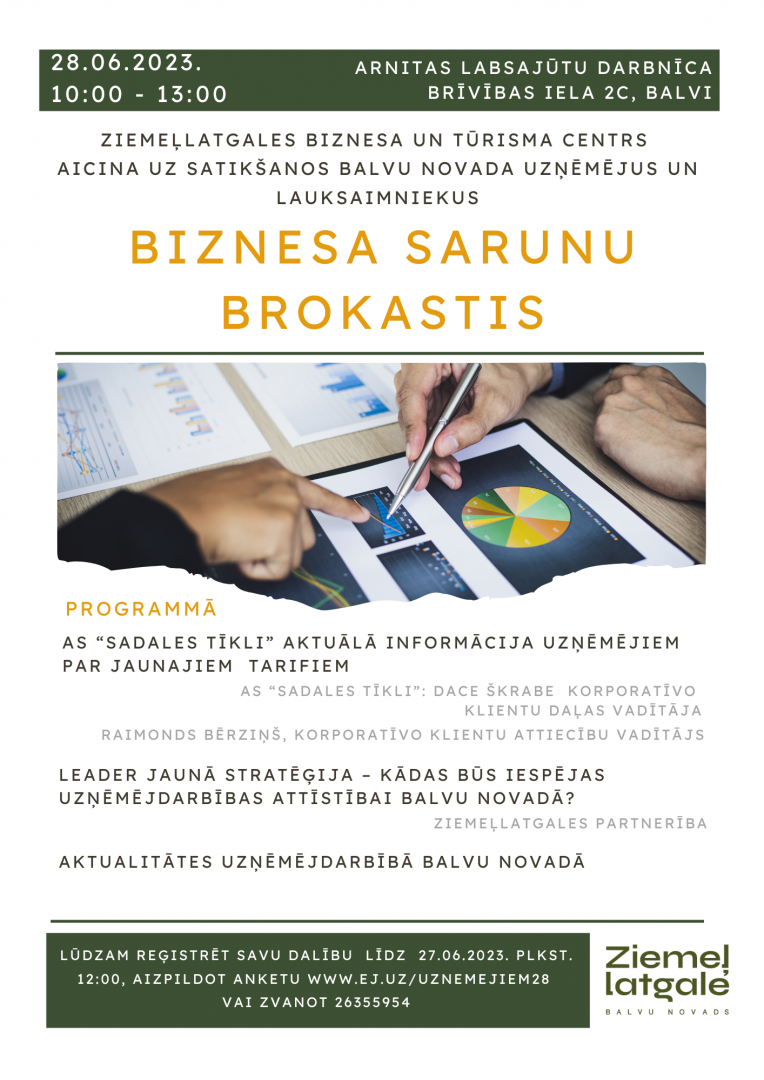 Ikviens Balvu novada uzņēmējs un lauksaimnieks aicināts piedalīties Ziemeļlatgales biznesa un tūrisma centra rīkotajās “Biznesa sarunu brokastīs”, kas norisināsies 28.jūnijā no plkst. 10 līdz 13 Arnitas labsajūtu darbnīcā (adrese: Brīvības 2c, Balvi).