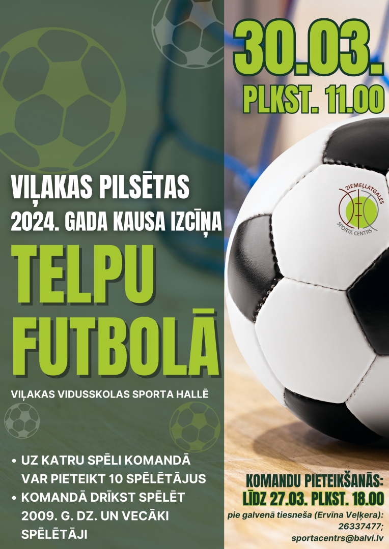 30. martā Viļakas vidusskolas sporta hallē norisināsies Viļakas pilsētas 2024.gada kausa izcīņa telpu futbolā.