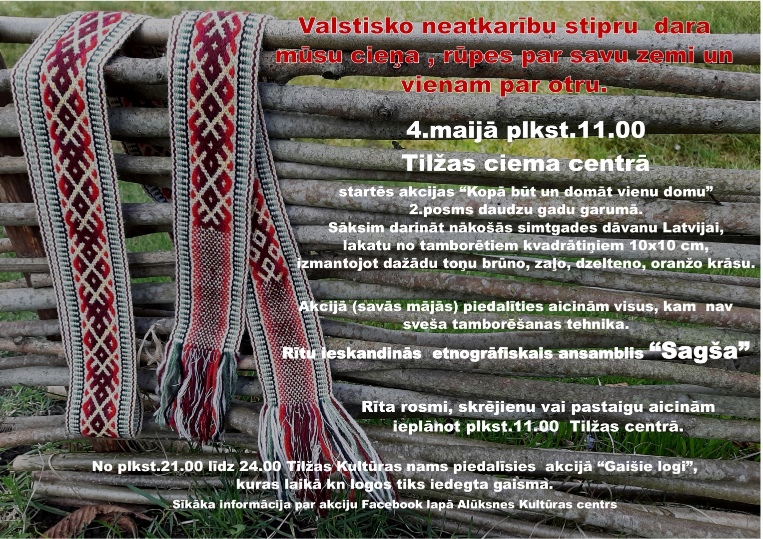 4.maijā plkst. 11:00 Tilžas ciema centrā startē akcijas “Kopā būt un domāt vienu domu” 2.posms daudzu gadu garumā. Sāksim darināt nākošās simtgades dāvanu Latvijai, lakatu no tamborētiem kvadrātiņiem 10x10 cm, izmantojot dažādu toņu brūno, zaļo, dzelteno, oranžo krāsu. Akcijā piedalīties aicinām visus, kam nav sveša tamborēšanas tehnika.