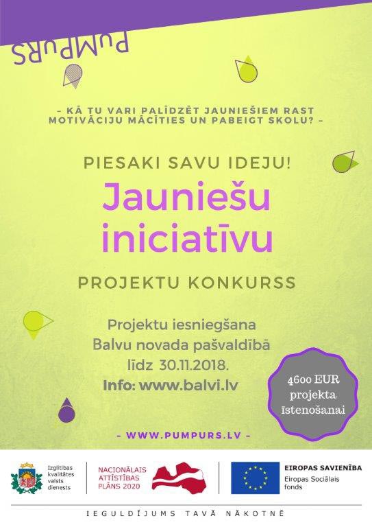 Balvu novada pašvaldība aicina jauniešu organizācijas iesniegt jaunatnes iniciatīvu projektu pieteikumus. Projektu fokuss – skolēni ar risku nepabeigt skolu, viņu mācību motivācijas palielināšana un aktīvas līdzdalības veicināšana ikdienas dzīvē. Projektu konkurss notiek Eiropas Sociālā fonda projekta “PuMPuRS”* ietvaros. Konkursa ietvaros iespējams iegūt 4600 eiro savas idejas īstenošanai. Pretendenti savus pieteikumus var iesniegt līdz 2018. gada 30. novembrim.