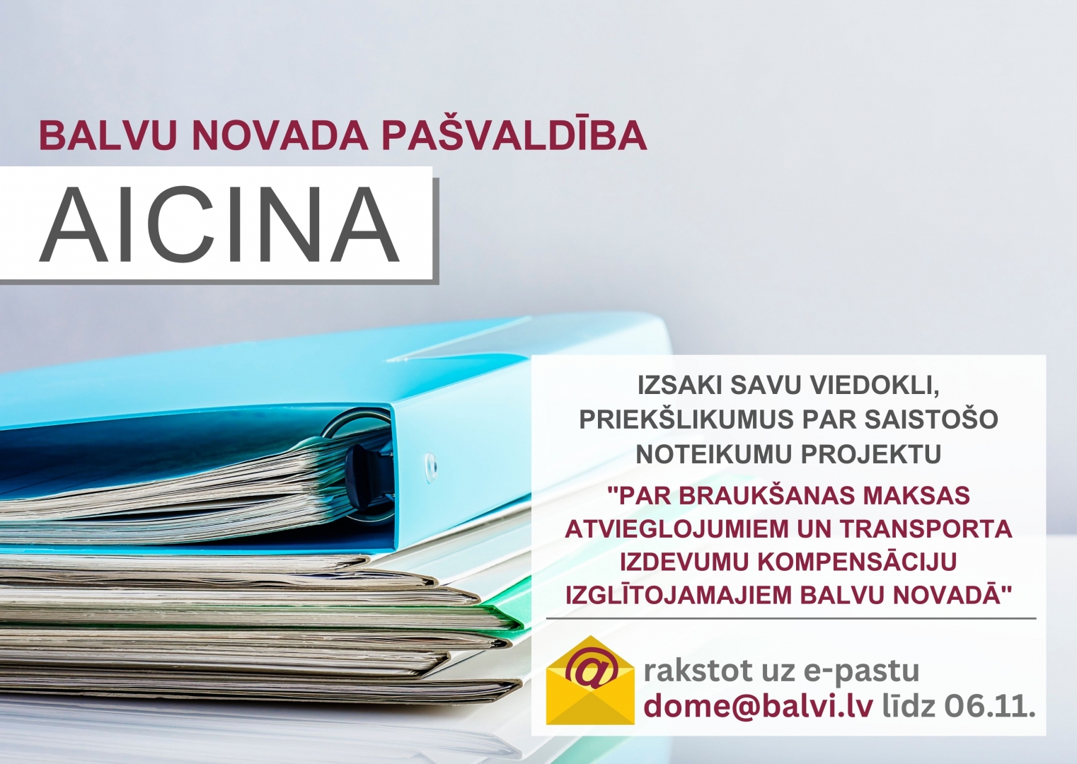 - Termiņš viedokļa izteikšanai: 23.10.2023. – 06.11.2023. plkst. 17.00, sūtot uz pašvaldības e-pastu dome@balvi.lv.