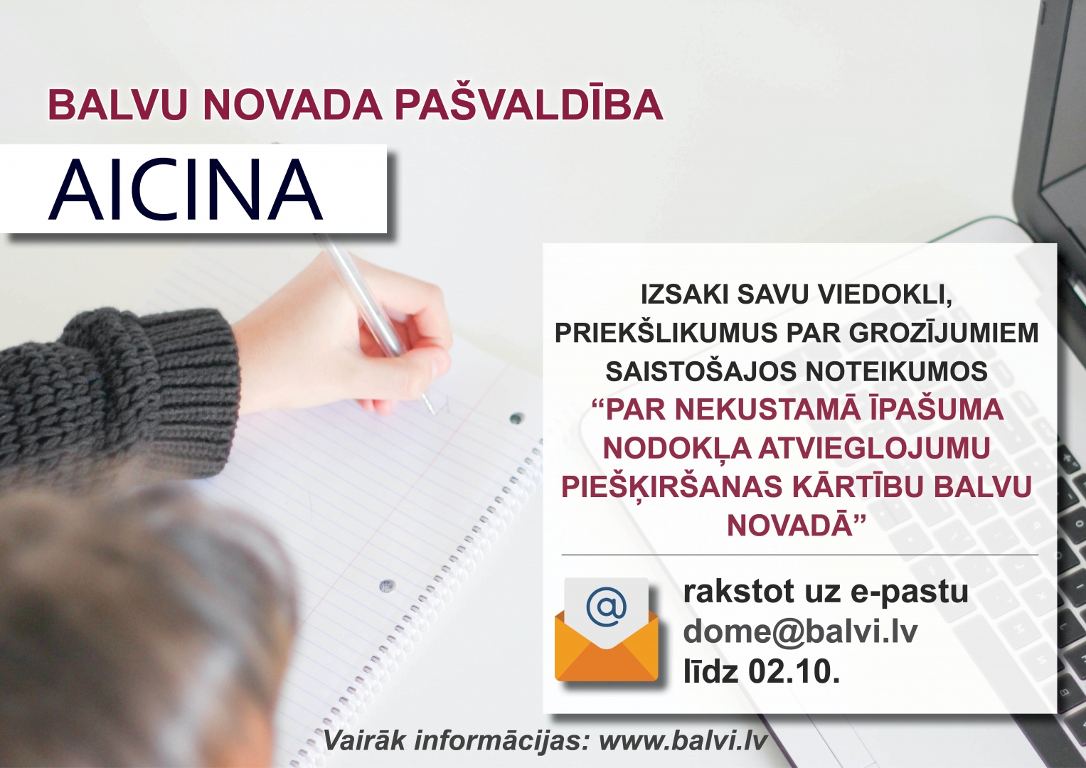 Termiņš viedokļa izteikšanai: 18.09.2023. – 03.10.2023. plkst. 17.00, sūtot uz pašvaldības e-pastu dome@balvi.lv.