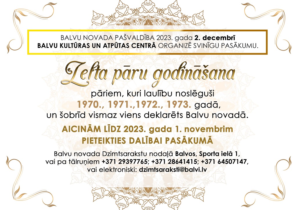2023. gada 2. decembrī Balvos godināsim Zelta pārus, kuri laulību noslēguši 1970., 1971., 1972., 1973. gadā.