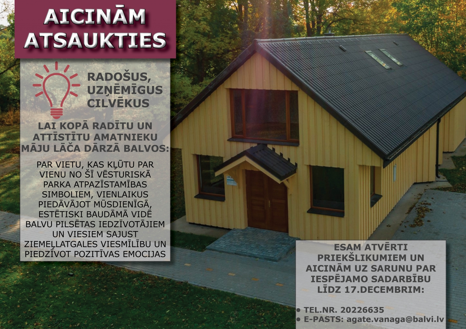 Aicinām atsaukties radošus, uzņēmīgus cilvēkus, lai kopā radītu un attīstītu Amatnieku māju Lāča dārzā Balvos par vietu, kas kļūtu par vienu no šī vēsturiskā parka atpazīstamības simboliem, vienlaikus piedāvājot mūsdienīgā, estētiski baudāmā vidē Balvu pilsētas iedzīvotājiem un viesiem sajust Ziemeļlatgales viesmīlību un piedzīvot pozitīvas emocijas.