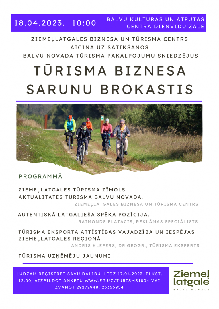 2023.gada 18.aprīlī plkst. 10.00 esošos un potenciālos tūrisma objektu saimniekus un tūrisma uzņēmējus no Balvu novada aicinām uz tikšanos pasākumā “Tūrisma biznesa sarunu brokastis”, kas notiks Balvos, Balvu Kultūras un atpūtas centra dienvidu zālē.