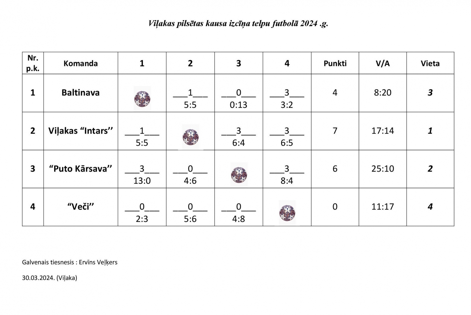 30. martā Viļakas vidusskolas sporta hallē norisinājās Viļakas pilsētas 2024.gada kausa izcīņa telpu futbolā. Uz turnīru pieteicās četras komandas – Baltinava, Viļakas “Intars’’, “Veči’’, “Puto Kārsava’’. Lai noskaidrotu uzvarētāju, komandas spēlēja katra ar katru.