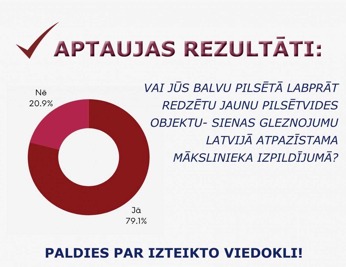 Sākot ar 1. februāri Balvu novada iedzīvotāji tika aicināti piedalīties aptaujā Balvu novada pašvaldības Facebook lapā www.facebook.com/balvunovadapasvaldiba un izteikt viedokli - Vai Jūs Balvu pilsētā labprāt redzētu jaunu pilsētvides objektu- sienas gleznojumu Latvijā atpazīstama mākslinieka izpildījumā?