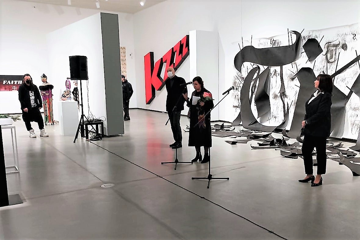 Izstādes atklāšana. Pie mikrofoniem Izstādes kuratori – L.Laganovskis, E.Ansone, pa labi - Latvijas Vizuālās mākslas departamenta vadītāja Ginta Gerharde-Upeniece.