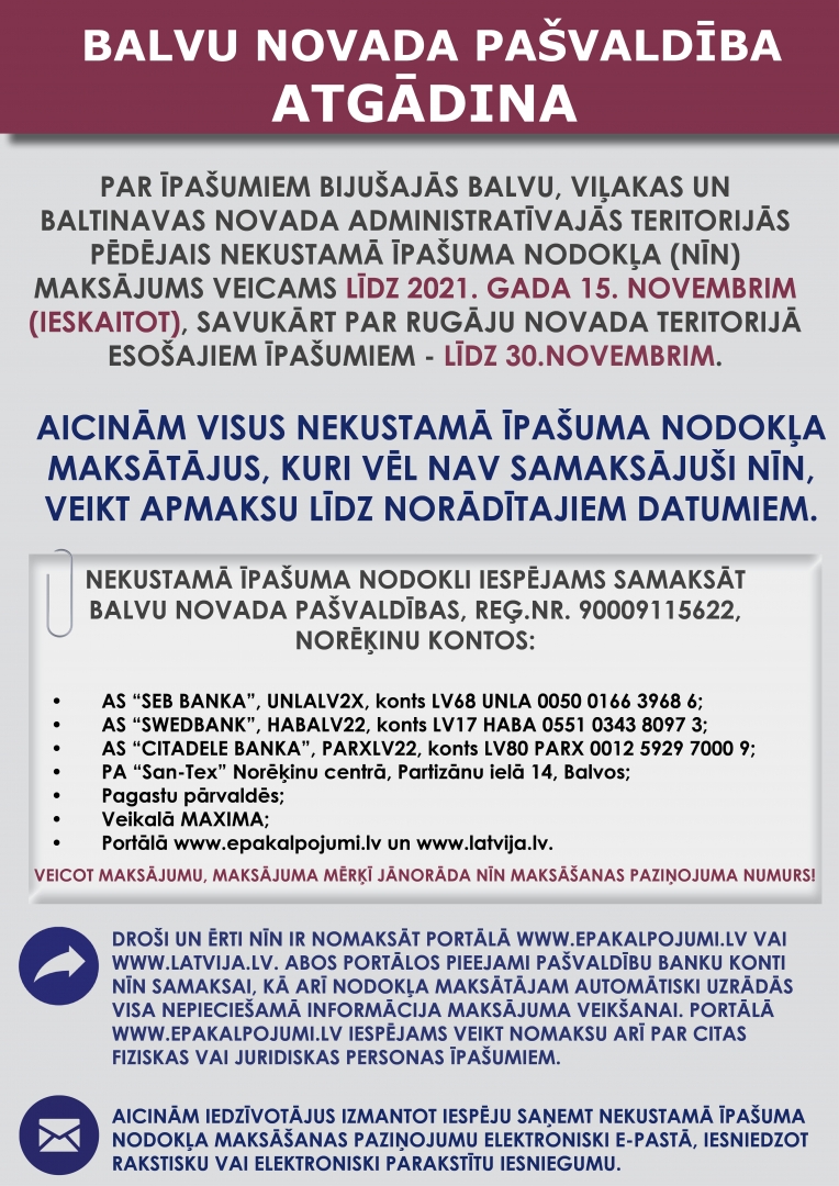 Balvu novada pašvaldība atgādina, ka par īpašumiem bijušajās Balvu, Viļakas un Baltinavas novada administratīvajās teritorijās pēdējais nekustamā īpašuma nodokļa (NĪN) maksājums veicams līdz 2021. gada 15. novembrim, savukārt par Rugāju novada teritorijā esošajiem īpašumiem, pamatojoties uz Rugāju novada pašvaldības 2021.gada 18.marta lēmumu Nr.91 “Par nekustamā īpašuma nodokļa samaksas termiņu pārcelšanu” - līdz 30.novembrim.