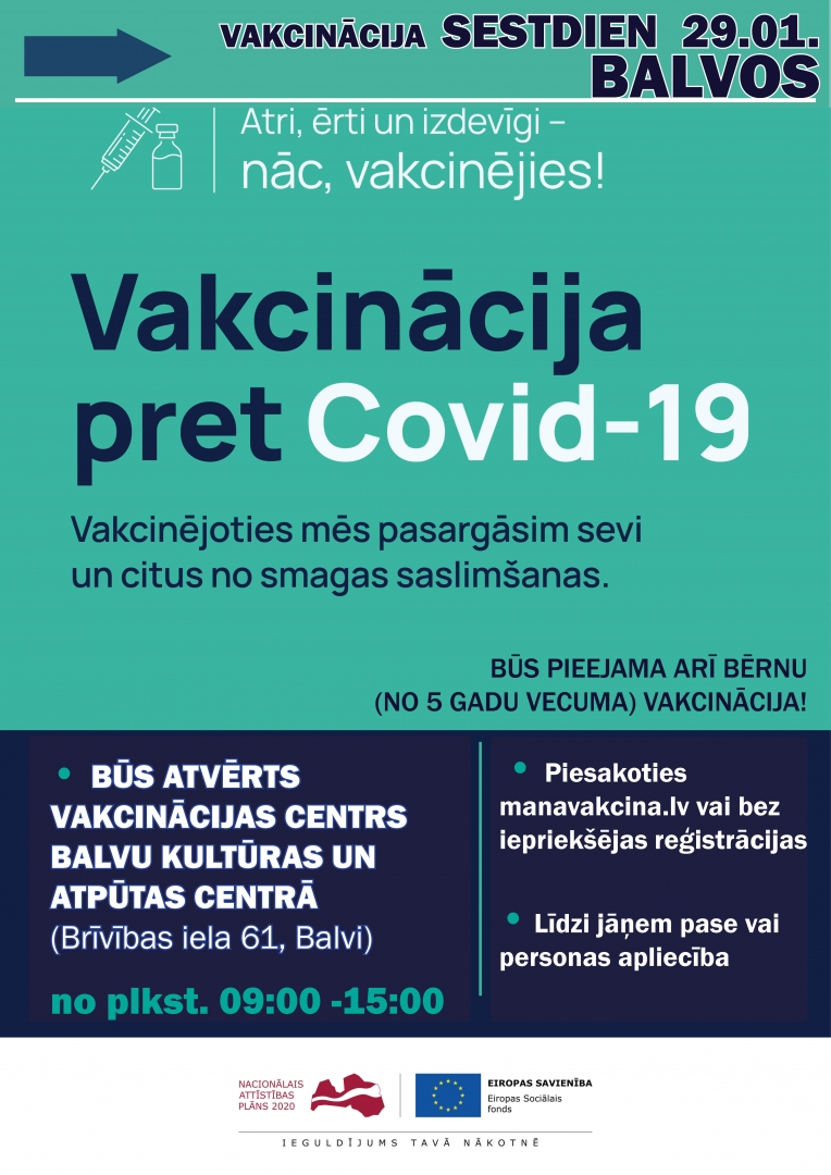Turpinot vecākiem un bērniem ērtu vakcinācijas pakalpojuma saņemšanu, šajā nedēļas nogalē vairākos novadu vakcinācijas centros bērniem vecumā no 5 līdz 11 gadiem būs iespēja saņemt vakcīnas pret Covid-19, tostarp arī Balvos (Balvu kultūras un atpūtas centrā Brīvības ielā 61).