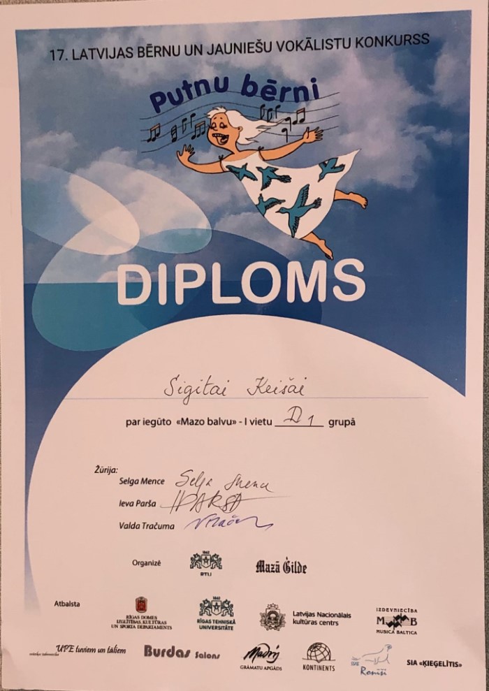 4.decembrī notika apbalvošanas ceremonija. Bija liels prieks un gandarījums. Kora klases audzēkne – Sigita Keiša D grupā ieguva konkursa ,,Putnu bērni” Mazo balvu un 1.vietu.