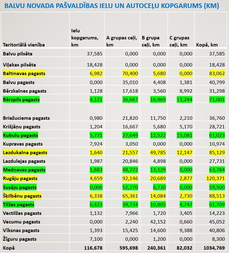 Iekrāsoti pagasti ar lielāko autoceļu/ielu kopgarumu. Dzeltenā krāsā pagasti ar vislielāko ceļu kopgarumu (km). Zaļajā krāsā iekrāsoti pagasti ar ceļu kopgarumu ~60-70 km.