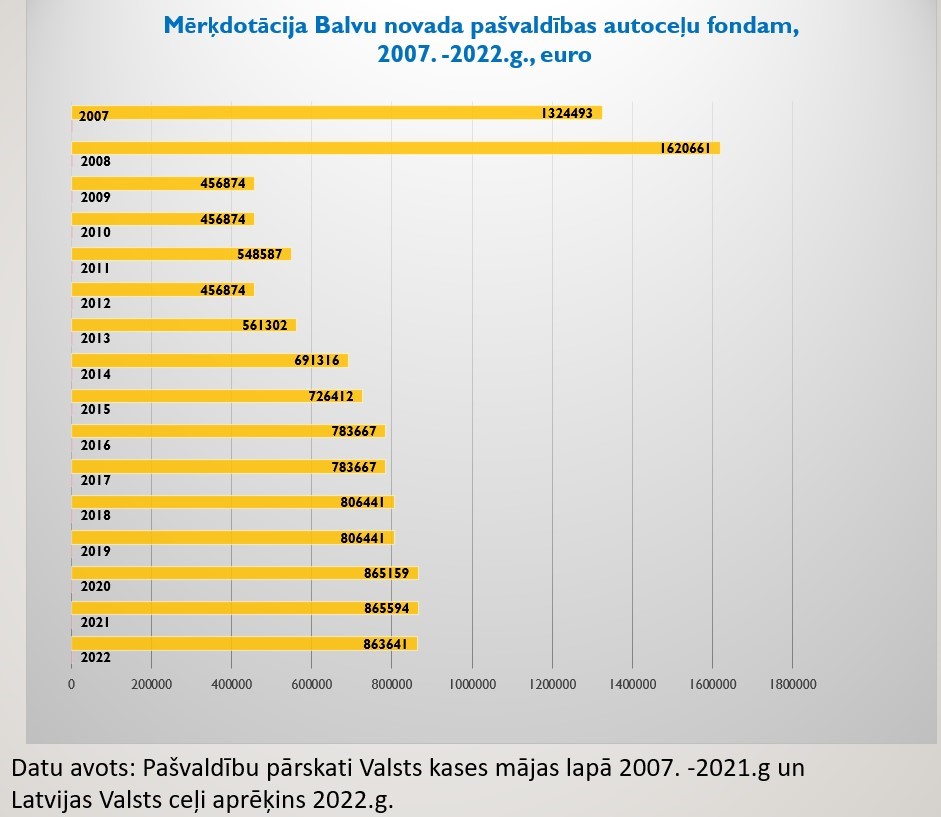 Mērķdotācija Balvu novada pašvaldības autoceļu fondam (2007. - 2022.gads) euro.