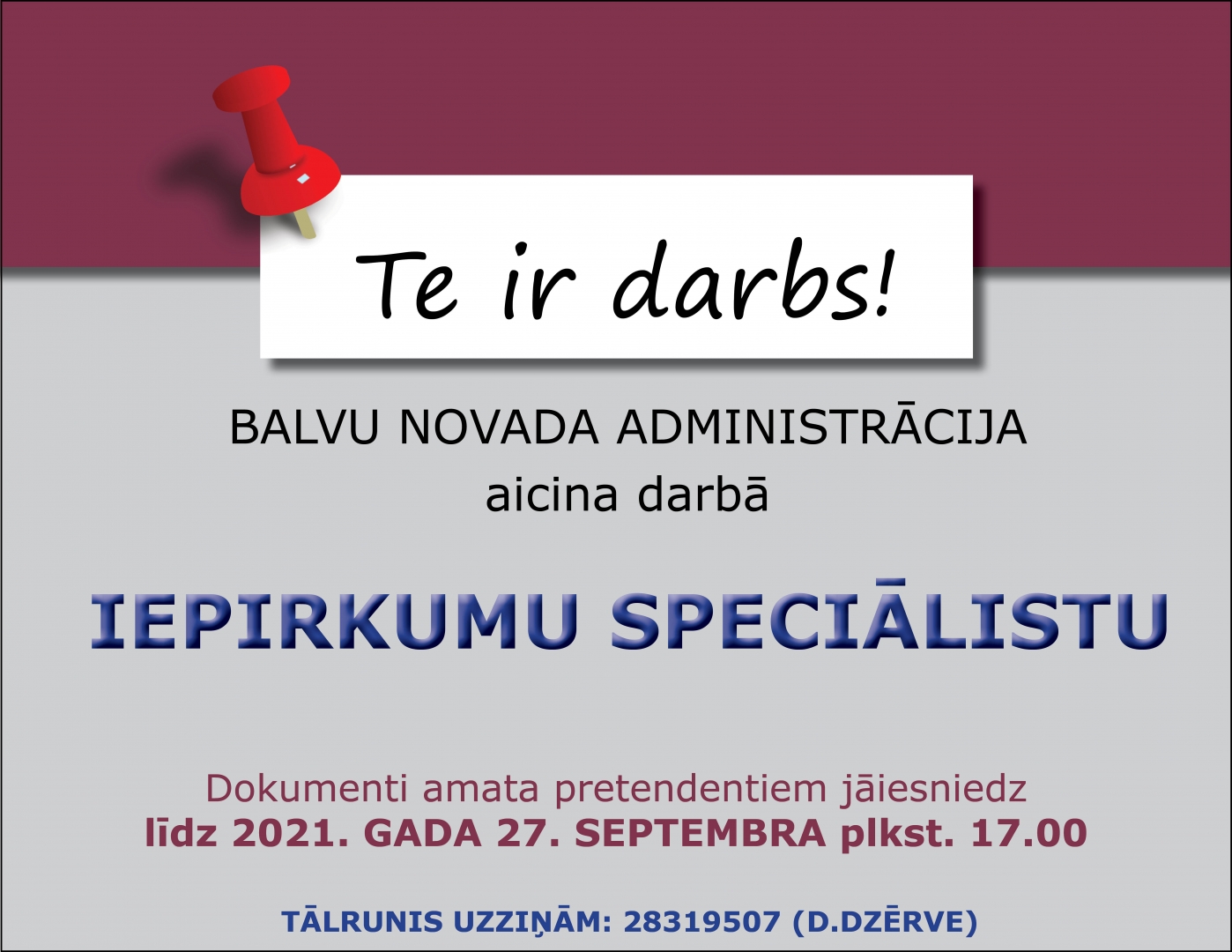 - personīgi Balvu novada pašvaldībā, Bērzpils ielā 1A, Balvos, 1.stāvā, ievietojot pastkastē slēgtu aploksni uz kuras norādīts: „Pieteikums uz Iepirkumu speciālista amatu”, iesniedzēja vārds, uzvārds un adrese;