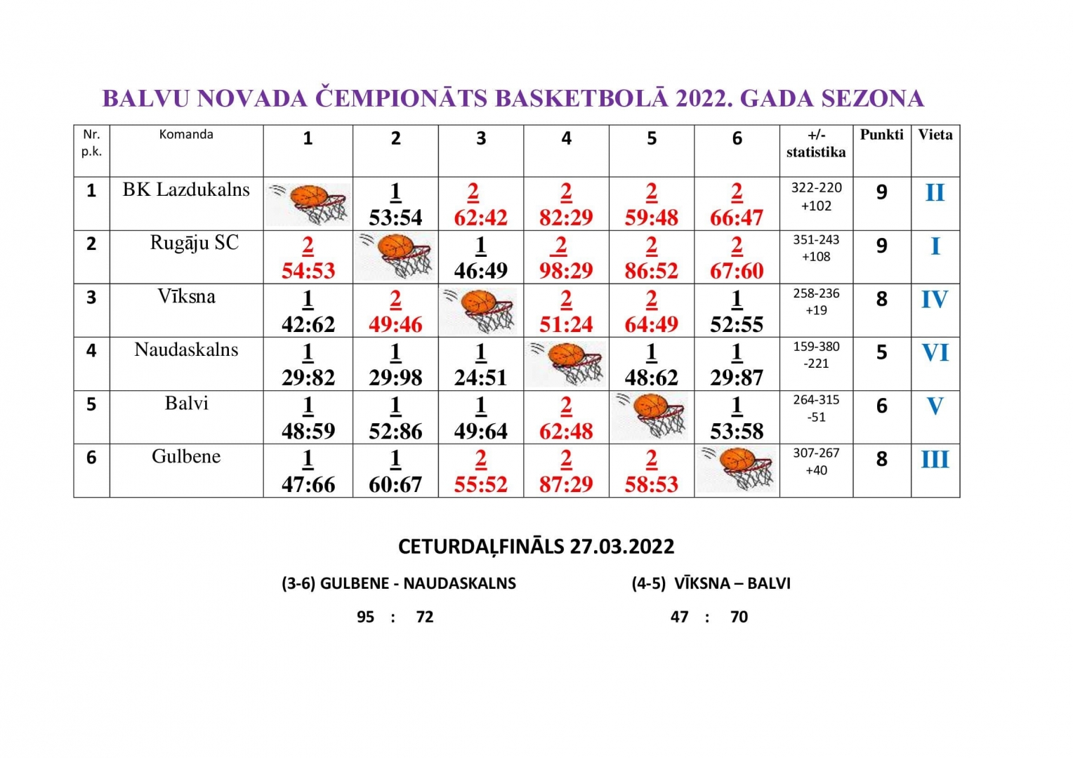 Balvu novada čempionāta basketbolā ceturtdaļfināla rezultāti