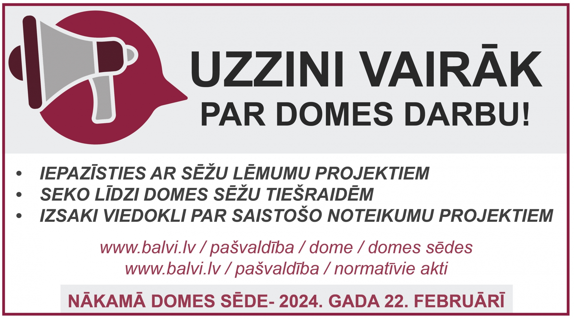 Balvu novada domes priekšsēdētājs Sergejs Maksimovs sasauc domes sēdi 2024.gada 22.februārī plkst.09.00.