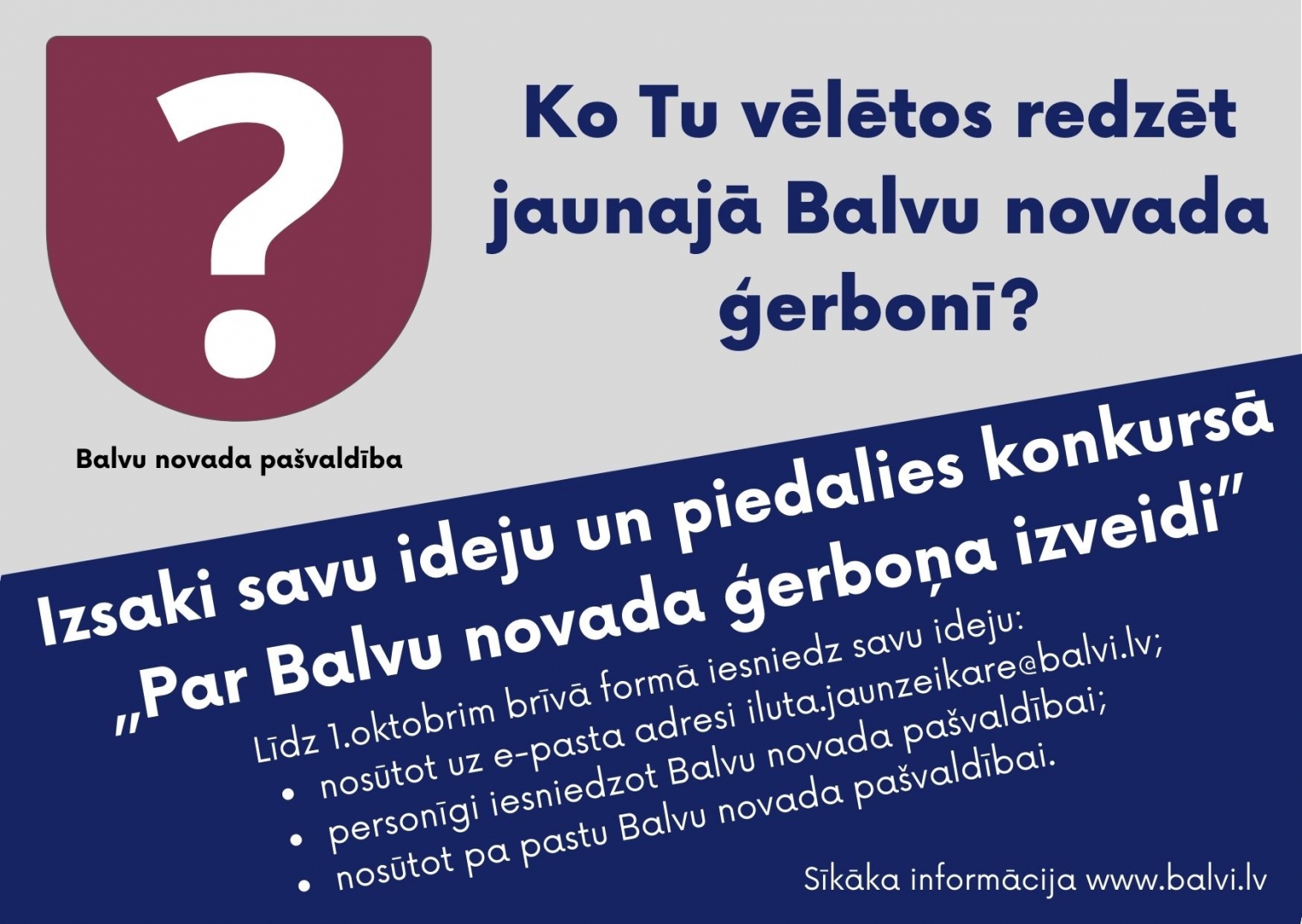 Līdz 1.oktobrim aicinām ikvienu – fizisku, juridisku personu vai personu grupas - iesūtīt idejas, kādam būtu jāizskatās jaunajam Balvu novada ģerbonim.