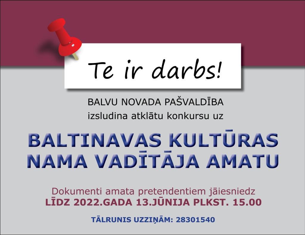 Balvu novada pašvaldība Reģ.Nr. 90009115622 izsludina atklātu konkursu uz Baltinavas kultūras nama vadītāja amatu uz nenoteiktu laiku.