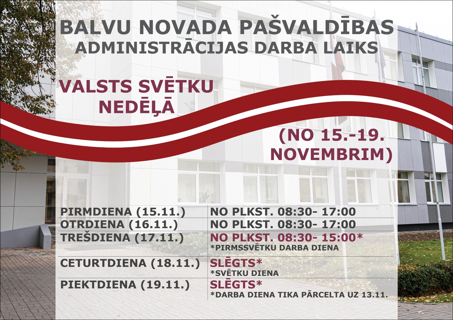 Balvu novada pašvaldības administrācijas darba laiks Valsts svētku nedēļā