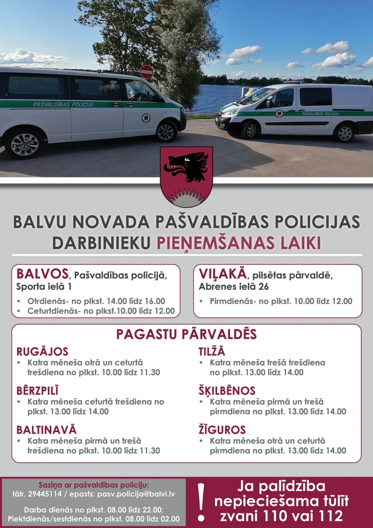 Informācija par Balvu novada Pašvaldības policijas darbinieku pieņemšanas laikiem, sākot ar 2023. gada ar 1.maiju: