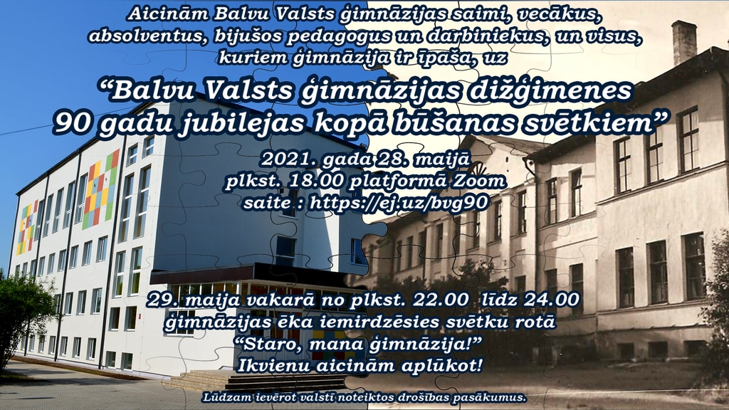 28.maijā plkst.18:00 Balvu Valsts ģimnāzija aicina vecākus, absolventus, bijušos pedagogus un darbiniekus, un visus, kuriem ģimnāzija ir īpaša, uz "Balvu Valsts ģimnāzijas dižģimenes 90 gadu jubilejas kopā būšanas svētkiem" Zoom platformā: https://ej.uz/bvg90!