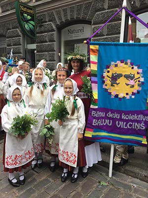 Gājiens. Visu svētku dalībnieku parāde. Lepni nesām savus Ziemļlatgales bērnu svētku tērpus, kolektīva jauno karogu, vecāku sagādātos ozollapu pušķīšus un arī Latvijas karogu. „Balvu vilciņa” karogu darinājusi dejotāja Deivja mamma Anita Kairiša. Bet par karogu nešanu mums savs stāsts. Mēs esam mazi, bet karogi lieli, līdz ar to ar saviem dejotāju resursiem iztikt nevaram. Palīgā nāca dejotāju radi un draugi. Adriana tētis jau jāņem darbā par kolektīva karognesēju un jāuzšuj speciāls tautas tērps, jo šī viņam nebija pirmā reize pie karoga. Savukārt, otrs karognesējs, iespējams, ir nākamā Latvijas tenisa zvaigzne, kas piekrita palīdzēt, jo viņa drauga māsa dejo „Balvu vilciņā”. Starp citu, paldies „Cielaviņas” Kristiānam, kurš laipni aizdeva savu tautas tērpu šim svarīgajam pasākumam. Un arī Kubulu Kultūras nama Maijai par tērpiem dejotāju māmiņām.