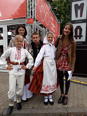 Saruna Latvijas Radio 1 Dziesmu svētku studijā pie Brīvības pieminekļa. Jā, atradām brītiņu starp mēģinājumiem, lai arī radio klausītājus un tiešraides skatītājus internetā iepazīstinātu ar mūsu Ziemeļlatgales tērpiem, kā arī pastāstītu vairāk par savu kolektīvu un mūsu iespaidiem Dziesmu un deju svētkos. Bijām nobijušies, jo šāda iespēja – atkal pirmo reizi! Intervijā noskaidrojām, ka puišiem visērtāk ikdienā ir staigāt tautas tērpā, bet meitenēm tieši otrādi – grūtāk, jo tērpā nedrīkst slikti uzvesties...