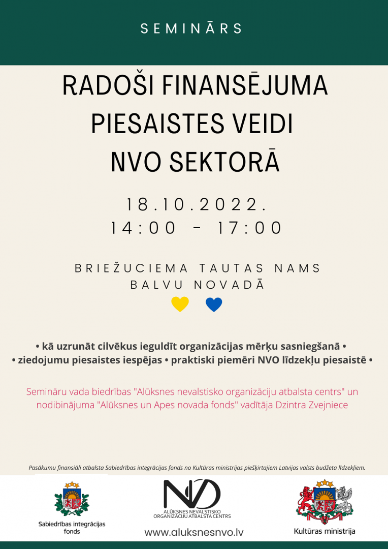 8.oktobrī pulksten 14.00 norisināsies seminārs "Radoši finansējuma piesaistes veidi NVO sektorā" Balvu novada Briežuciema tautas namā, kur biedrības "Alūksnes nevalstisko organizāciju atbalsta centrs" un nodibinājuma "Alūksnes un Apes novada fonds" vadītāja Dzintra Zvejniece dalīsies ar vairāk nekā 20 gadu laikā uzkrāto pieredzi un iepazīstinās ar reāliem piemēriem, kā NVO piesaista līdzekļus savas darbības nodrošināšanai un jaunu projektu īstenošanai.