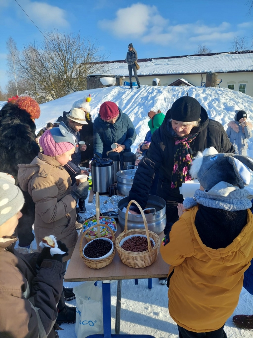 Arī Benislavas etnogrāfiskais ansamblis visus apkārtējos priecēja ar savām skanīgajām dziesmām latgaliešu valodā. Tomēr bērniem vislielākais prieks bija par braukšanu no kalniņa ar ragavām un mielošanās ar siltu tēju, vārītiem zirņiem, pupām un pankūkām,jo tās ir vienas no svarīgākajām Meteņdienas tradīcijām.