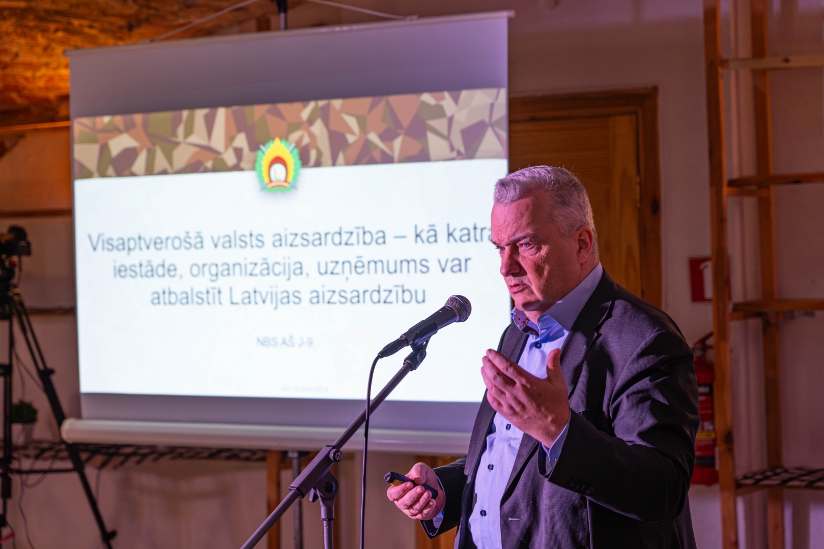 Nacionālo bruņoto spēku Apvienotā štāba civilās aizsardzības eksperts Ričards Batarāgs klātesošos iepazīstināja ar visaptverošu valsts aizsardzību – kā katra organizācija, iestāde, uzņēmums var atbalstīt Latvijas aizsardzību.