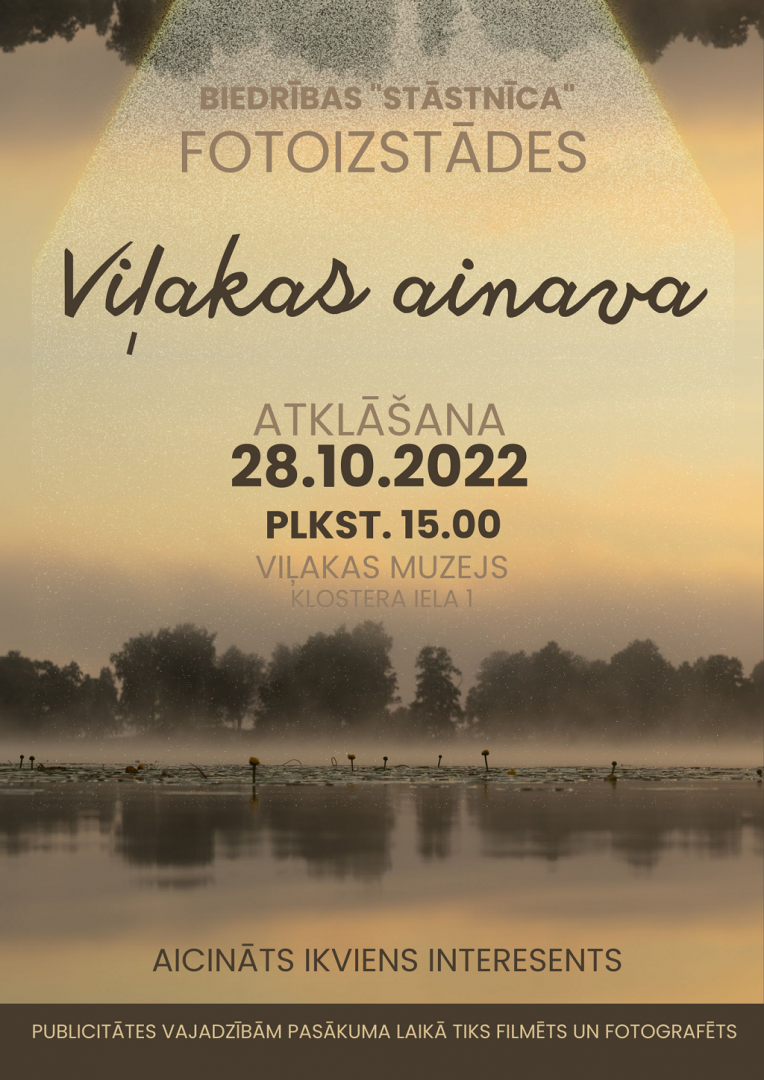 Biedrība “Stāstnīca” sadarbībā ar Balvu novada Viļakas muzeju organizē fotoizstādes “ Viļakas ainava” atklāšanu 2022.gada 28.oktobrī plkst. 15:00, Viļakas muzejā (Klostera iela 1, Viļaka). Atklāšanas pasākumā plāno piedalīties gandrīz visi izstādē iekļauto darbu autori.Viņi iepazīstinās ar savu darbību fotogrāfijas jomā un niansēm, iemūžinot Viļakas ainavu. Atklāšanas laikā notiks loterija, kurā veiksmīgais apmeklētājs varēs iegūt īpašumā vienu jebkura fotogrāfa darbu ar autora autogrāfu.