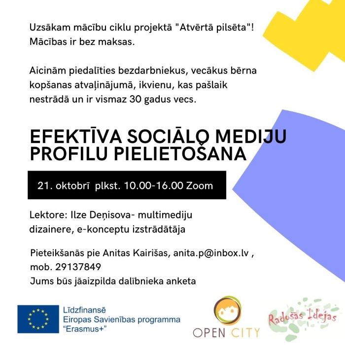 21. oktobrī- plkst.10.00-16.00 ZOOM seminārs "EFEKTĪVA SOCIĀLO MEDIJU PROFILU PIELIETOŠANA", Projekts „Atvērtā pilsēta”. Aicinām piedalīties bezdarbniekus, vecākus bērna kopšanas atvaļinājumā, ikvienu, kas pašlaik nestrādā un ir vismaz 30 gadu veci. Pieteikšanās pie Anitas Kairišas, anita.p@inbox.lv, 29137849. Biedrības „Radošās Idejas” ES „Erasmus” projekts „Open City”.