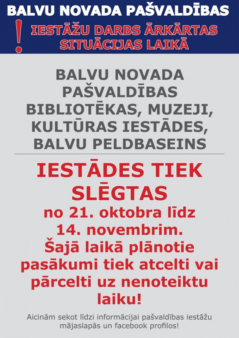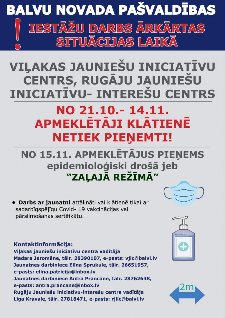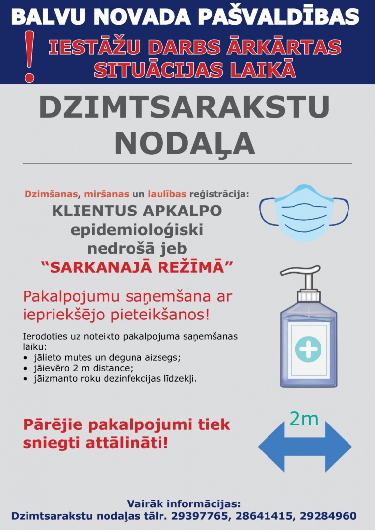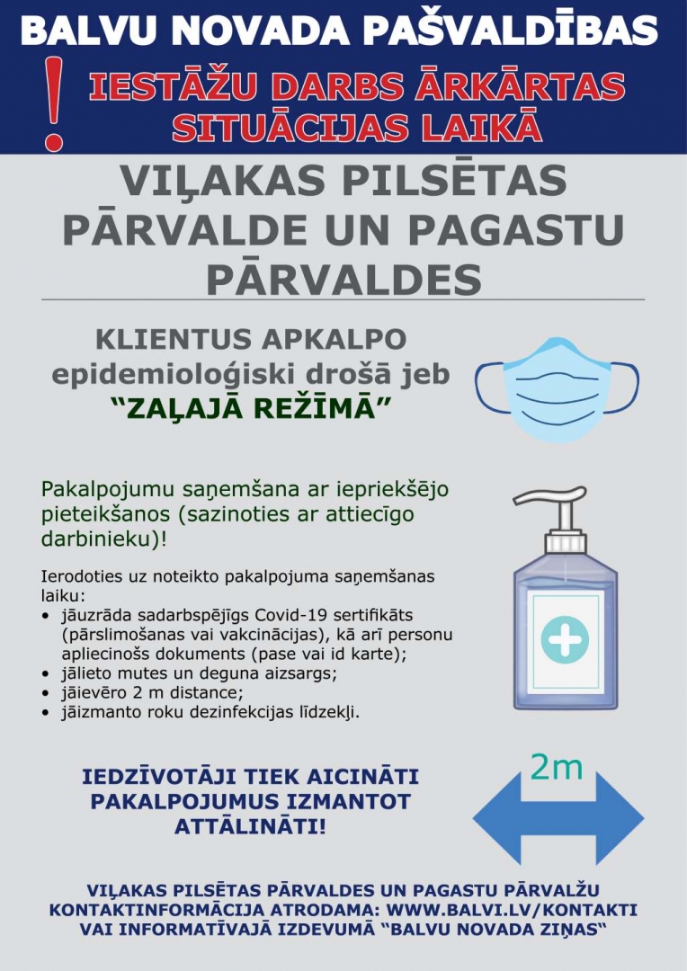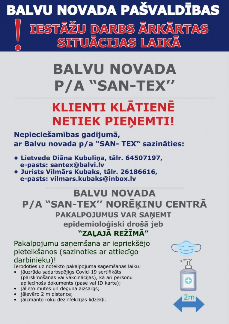 Lai iedzīvotājiem būtu vieglāk izprast Balvu novada pašvaldības iestāžu apmeklētāju pieņemšanu, pakalpojumu sniegšanu ārkārtas situācijas laikā, ir izveidoti informatīvie paziņojumi, kuros apkopota klientu vai apmeklētāju pieņemšanas kārtība un speciālistu kontaktinformācija.