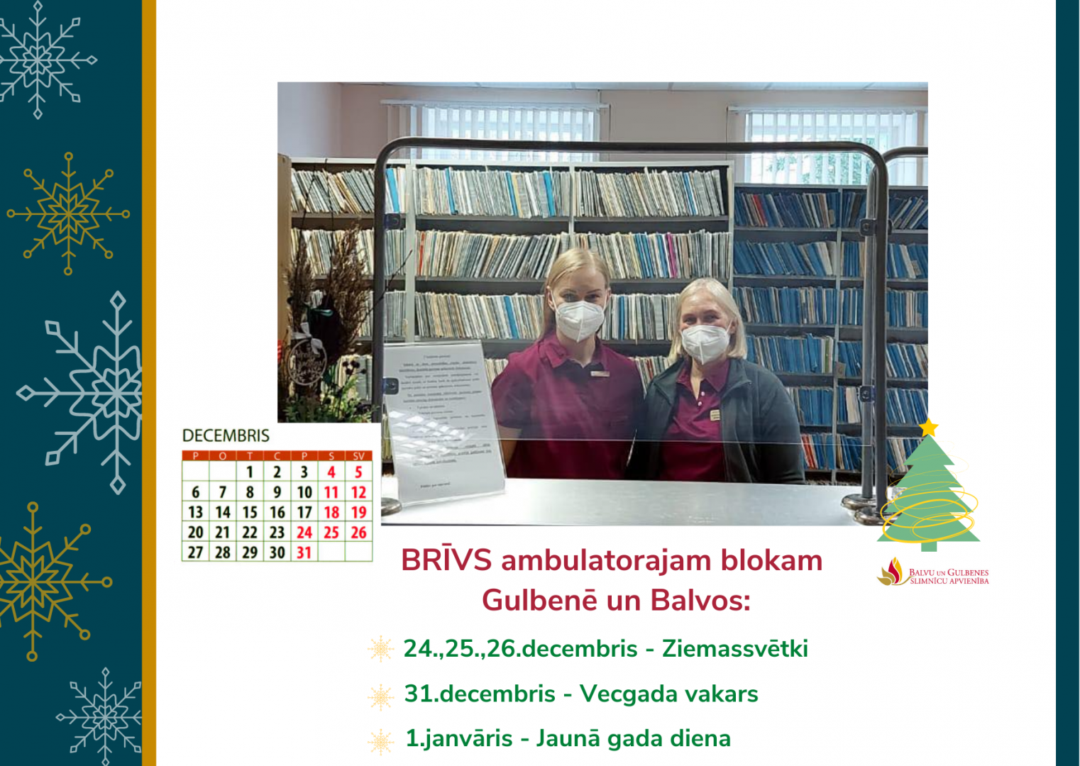 SIA “Balvu un Gulbenes slimnīcu apvienība” informē, ka Ziemassvētkos, no 24. līdz 26. decembrim, un Vecgada vakarā, 31. decembrī un 1. janvārī, Balvu slimnīcas uzņemšanas nodaļa un Steidzamās medicīniskās palīdzības punkts strādās ierastajā režīmā, savukārt ambulatorajam blokam (poliklīnikām) būs brīvdienas. Traumas vai pēkšņas saslimšanas gadījumā medicīnisko palīdzību sniedz steidzamās medicīniskās palīdzības punktos.