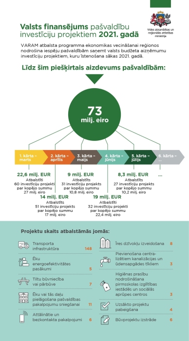 17. augustā Ministru kabinetā (MK) atbalstīts Vides aizsardzības un reģionālās attīstības ministrijas (VARAM) sagatavotais MK rīkojuma projekts “Par atbalstītajiem pašvaldību investīciju projektiem valsts aizdevumu piešķiršanai Covid-19 izraisītās krīzes seku mazināšanai un novēršanai”, piešķirot valsts aizdevumu tiem pašvaldību investīciju projektiem, kas izvērtēti projektu pieteikumu piektajā kārtā. Pašvaldībām investīciju projektu īstenošanai būs pieejami vairāk nekā 8 milj. Eiro, lielākie no tiem pēc finansējuma apjoma – Grobiņas novada daudzfunkcionālās pašvaldības ēkas atjaunošana, centrālas ielas pārbūve Gulbenē un apjomīga ceļa segumu atjaunošana vairākās vietās Daugavpils novadā.