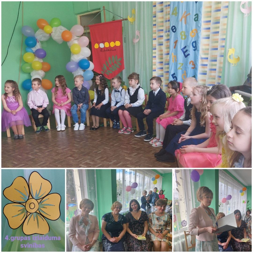 4.grupu absolvē 18 izglītojamie. Grupas skolotājas Inese Puka un Irēna Supe Brokāne ar skolotāju palīgu Līgu Vīksniņu pašiem draudzīgākajiem, gudrākajiem, labākajiem, čaklākajiem, uzmanīgākajiem bērniem novēl: