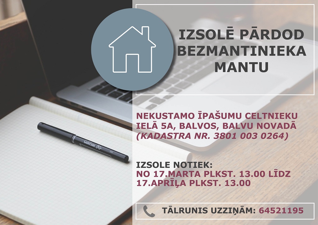 Izsolē pārdod bezmantinieka mantu - nekustamo īpašumu Celtnieku ielā 5A, Balvos, Balvu novadā, kadastra Nr.3801 003 0264. Nekustamais īpašums sastāv no zemes gabala ar kadastra apzīmējumu 3801 003 0264 un kopējo platību 1244 kvm, dzīvojamās ēkas ar kadastra apzīmējumu 3801 003 0264 001 un kopējo platību 59,7 kvm un saimniecības ēkas ar kadastra apzīmējumu 3801 003 0264 002, šķūņa ēkas ar kadastra apzīmējumu 3801 003 0264 003, kūts ēkas ar kadastra apzīmējumu 3801 003 0264 004.