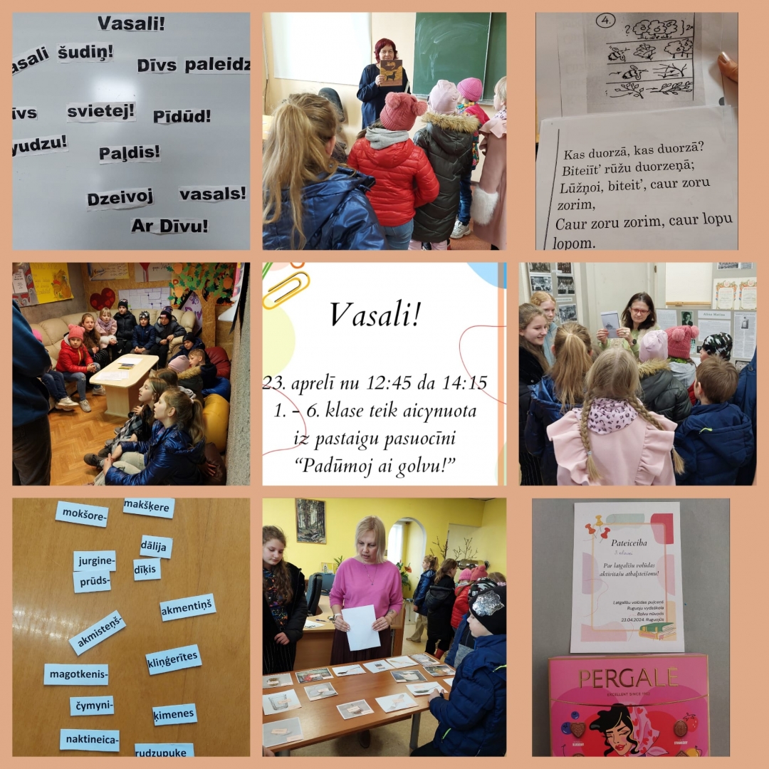 23.aprīlī Rugāju vidusskolas latgaliešu valodas pulciņš organizēja pasākumu 1.-6.klasei ”Padūmoj ai golvu”.