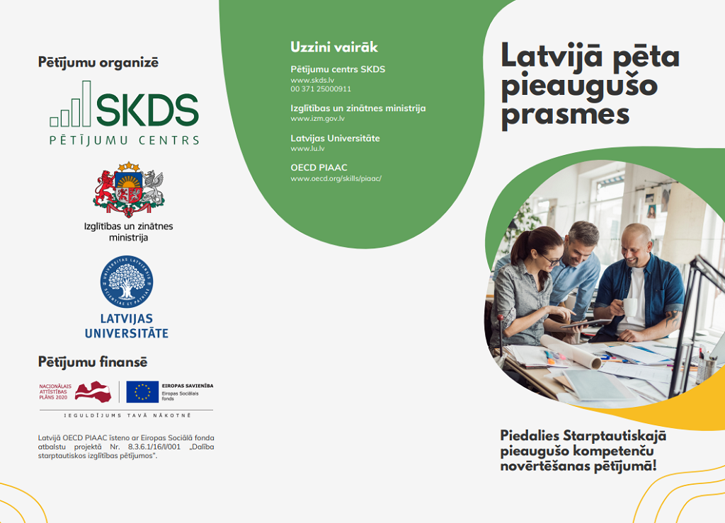 Oktobra nogalē ar Eiropas Sociālā fonda atbalstu Latvijā sākta Ekonomiskās sadarbības un attīstības organizācijas (OECD) Starptautiskā pieaugušo kompetenču novērtēšanas programmas pētījuma (PIAAC) īstenošana. Tas ir visplašākais pieaugušo prasmju un spēju pielietojuma pētījums pasaulē, un Latvija tajā piedalās pirmo reizi.Sadarbojoties Izglītības un zinātnes ministrijai, Latvijas Universitātei un pētījumu centram SKDS, līdz 2023. gada aprīlim plānots iegūt 7700 iedzīvotāju atbildes.