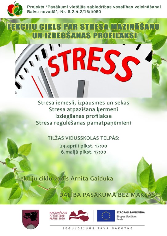 Tilžas vidusskolas telpās norisināsies lekciju cikls par stresa mazināšanu un izdegšanas profilaksi. Nodarbības notiks 24.aprīlī un 6.maijā.