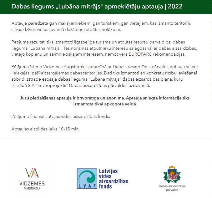Īpaši aizsargājamo dabas teritoriju pārvaldīšanas procesā iedzīvotāju un apmeklētāju viedoklis ir ļoti svarīgs un šī ir iespēja Jūsu redzējuma nodošanai par attīstību dabas liegumā “Lubāna mitrājs”. Pētījuma rezultāti tiks izmantoti ilgtspējīgai resursu pārvaldībai dabas liegumā “Lubāna mitrājs” , vietējo iedzīvotāju un atpūtnieku interešu salāgošanai ar dabas aizsardzības, tūrisma un saimnieciskajām interesēm. Iegūtie dati palīdzēs plānot ilgtspējīgu attīstību, atbilstošu infrastruktūru, kā arī mazināt cilvēku ietekmi uz dabas, kultūras vai ainavas vērtībām. Aptauja ir daļa no plašāka pētījuma, kas vienlaicīgi norisinās lielākajās īpaši aizsargājamās dabas teritorijās Latvijā. Dati tiks izmantoti arī konkrētu rīcību ieviešanai šobrīd izstrādē esošajā dabas lieguma “Lubāna mitrājs” dabas aizsardzības plānā.