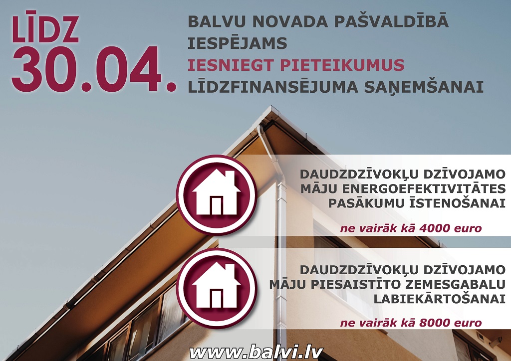 Balvu novada dome 2021. gada 23.decembrī pieņēma saistošos noteikumus Nr. 19/2021 “Par Balvu novada pašvaldības līdzfinansējuma apjomu un tā piešķiršanas kārtību daudzdzīvokļu dzīvojamo māju energoefektivitātes pasākumu veikšanai un piesaistīto zemesgabalu labiekārtošanai”, kas nosaka kārtību, līdzfinansējuma apmēru un piešķiršanas nosacījumus, kādā Balvu novada pašvaldība līdzfinansē daudzdzīvokļu dzīvojamo māju energoefektivitātes pasākumus, lai nodrošinātu energoresursu patēriņu samazinājumu, kā arī piesaistīto zemesgabalu labiekārtošanas pasākumus.