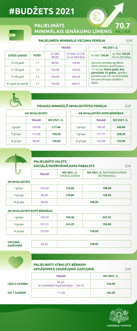 No šā gada 1. janvāra ir paaugstināti minimālo valsts pensiju un nodrošinājuma pabalsta apmēri, tādējādi nosakot augstākus minimālos ienākumu sliekšņus. Kopumā izmaņas ietekmē aptuveni 115 000 cilvēku. Tāpēc, lai sagatavotos jauno apmēru izmaksai un veiktu pielāgojumus IT sistēmās, no šā gada janvāra līdz aprīlim bija noteikts pārejas periods – minimālo pensiju un nodrošinājuma pabalstu izmaksu Valsts sociālās apdrošināšanas aģentūra (VSAA) nodrošināja atbilstoši apmēram un regulējumam, kāds bija noteikts līdz 2020. gada 31. decembrim.