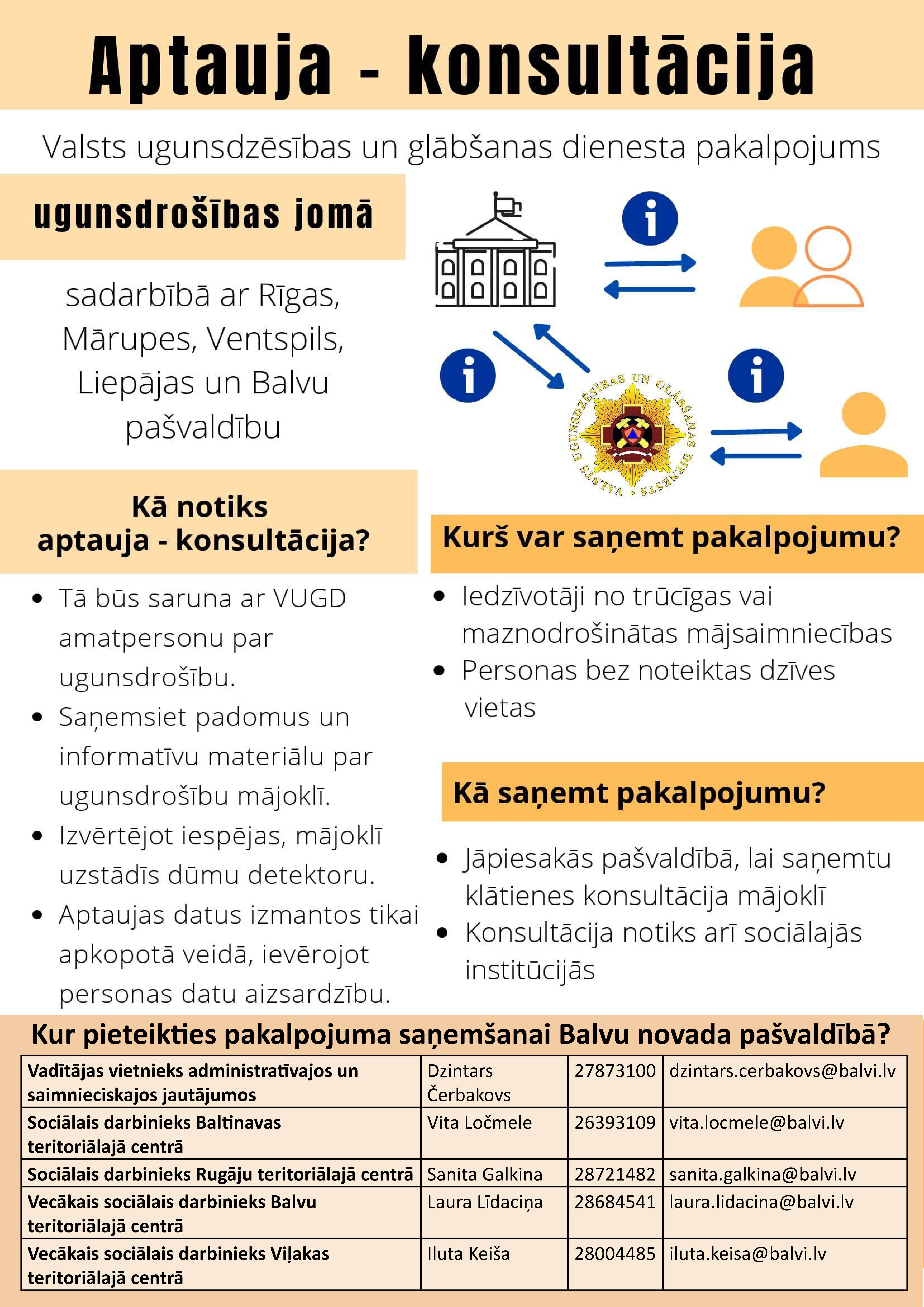 Valsts ugunsdzēsības un glābšanas dienests (VUDG) sadarbībā ar Balvu novada pašvaldību piedāvās konsultācijas – aptauju par ugunsdrošību iedzīvotājiem no trūcīgas un maznodrošinātas mājsaimniecības un personām bez noteiktas dzīvesvietas.